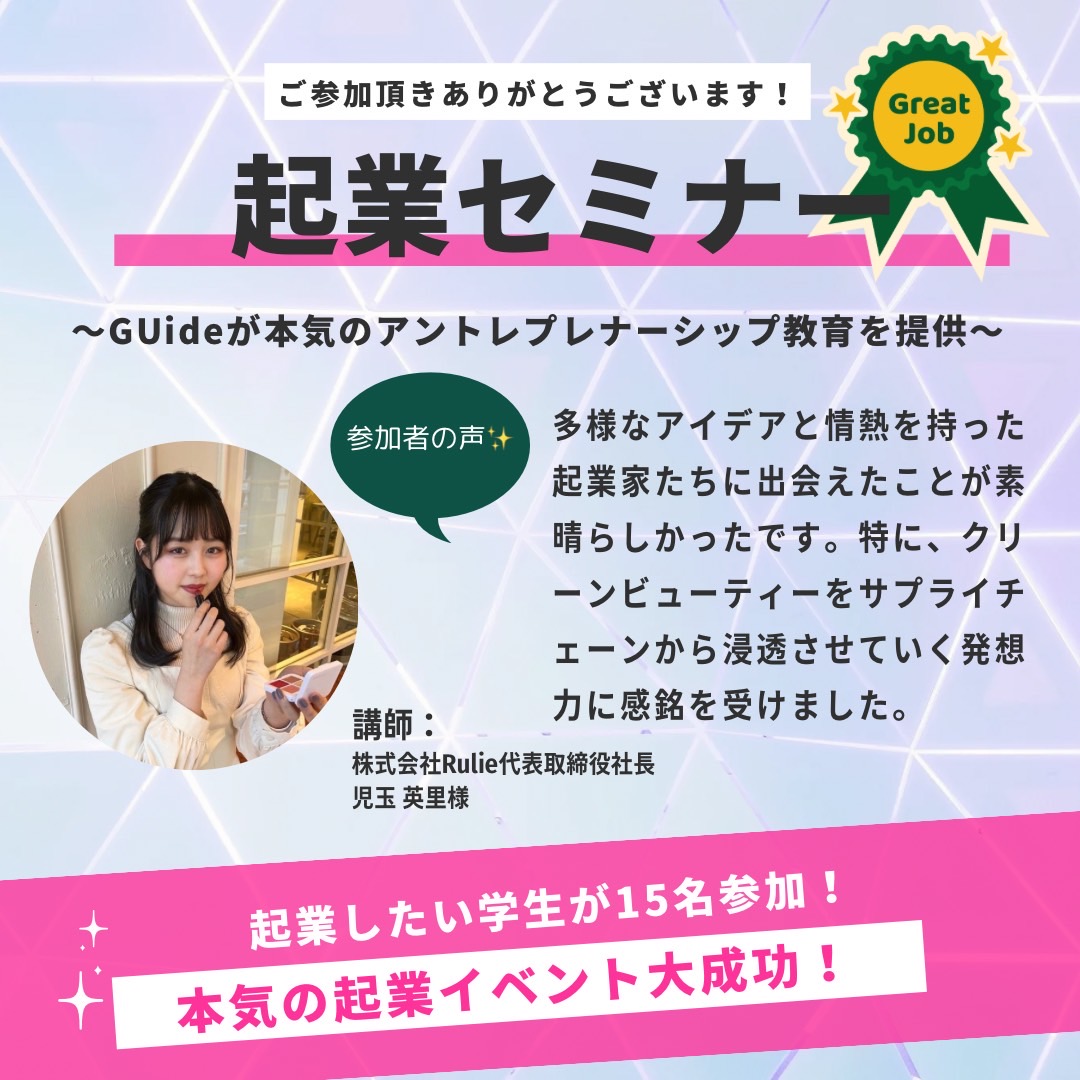 【✨イベント実施報告✨】 〜起業家による本気のアントレプレナーシップ教育プログラムを体感せよ〜 8/3(土)に株式会社Rulie代表取締役社長 児玉 英里様をお招きした起業セミナーを実施致しました!@rulie_offi … 続きを読む ☑起業セミナー